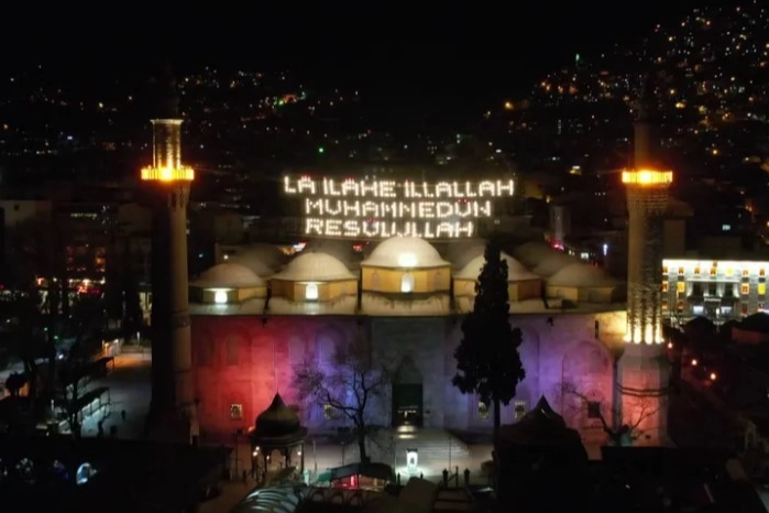 Ramazan ayının ikinci yarısı için Kültür ve Turizm Bakanlığı Vakıflar Genel Müdürlüğü İstanbul'daki mahya atölyesinde hazırlanarak Bursa'ya getirilen Kelime-i Tevhidi ‘La İlahe İllallah Muhammedün Resullullah' ustalarca caminin minareleri arasına asılmaya başlandı.