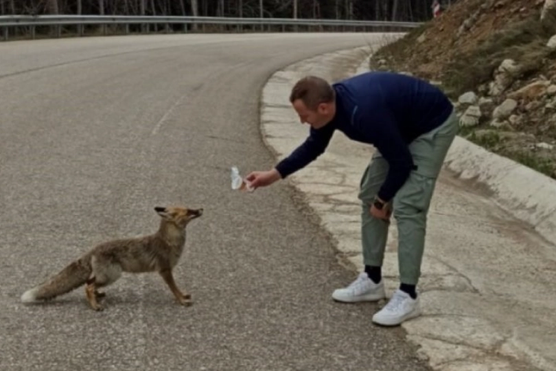 Yanında yiyecek olmadığı için tilkinin ayranla susuzluğunu gideren vatandaş o anları kamerası ile çekerek kayda aldı.
