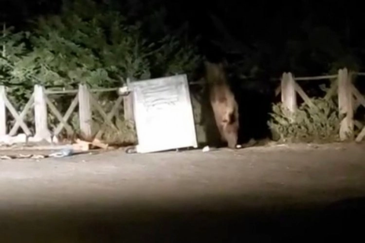 Bir süre boyunca araç farlarının yardımıyla yemek arayan ayı, konteyneri devirdi.