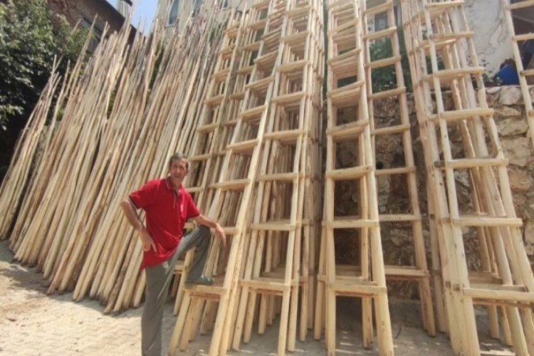 Bursa Orhangazi'ye bağlı Karsak Mahallesi'nde yaşayan ve 12 yıl önce bir fabrikadan emekli olduktan sonra hobi olarak başladığı zeytin toplama merdiveni imalatçısı Ali Ilgın, 8 ile 12 basamaklı ağaç merdiven üretiyor.