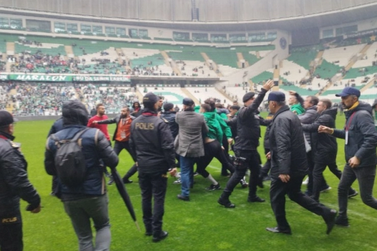 Bursa Büyükşehir Belediye Stadyumunda saat 14.00'de başlayan Bursaspor - Amed maçı öncesinde sahada gerginlik yaşandı. Mahşeri kalabalığa sahne olan ve geniş güvenlik önlemleri ile başlayan maçtan önce futbolcular arasında yaşanan gerginlik kısa sürede polis tarafından yatıştırıldı.