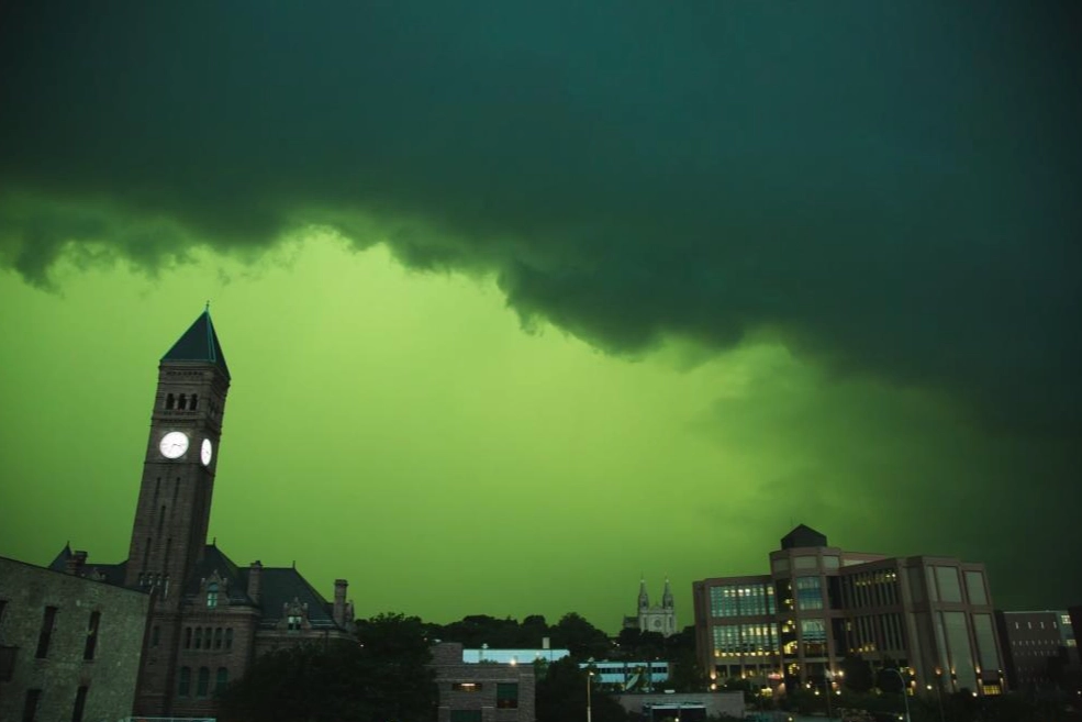 ABD’nin Güney Dakota eyaletinde yer alan Sioux Falls’ta 5 Temmuz’da derecho fırtınasının etkili olması ile gökyüzü yeşile döndü. Gökyüzünün rengi, bölge sakinlerini şaşkına uğratırken, görüntüler ve fotoğraflar sosyal medyanın gündemine oturdu. Uzmanlar, gökyüzünün neden yeşile döndüğünün net olmadığını ancak, temel nedenin bulutların çok fazla su taşıması nedeniyle mavi ışık yayma eğiliminde olduğunu ve mavi ışığın gün batımından gelen kırmızı ve sarı ışıkla birleştiğinde gökyüzünün yeşile döndüğü üzerinde duruyor. Ulusal Hava Durumu Servisi tarafından yapılan açıklamada ise, derecho fırtınasının etkili olduğu Güney Dakota, Minnesota ve Iowa'da yaklaşık 30 bin kişinin saatlerce elektriksiz kaldığı aktarıldı. Açıklamada, söz konusu fırtınanın saatte 93 kilometre rüzgar hızına sahip olduğu ifade edildi.