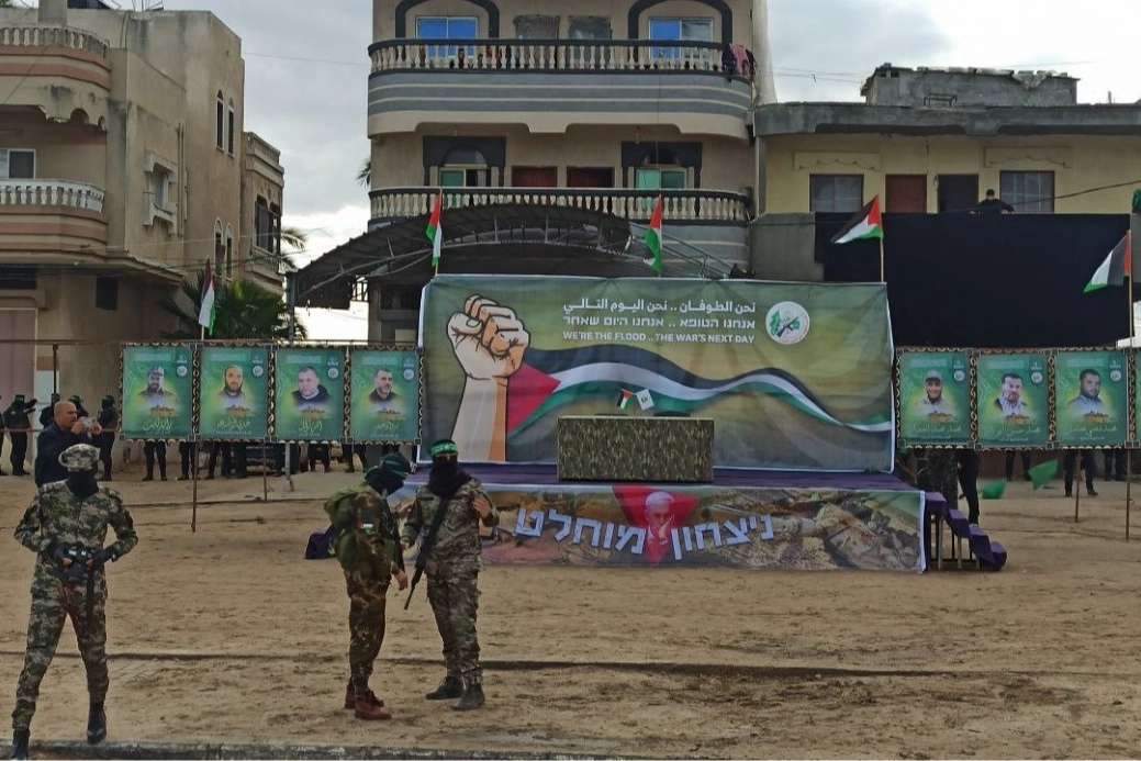Kızılhaç yetkilisi ile Kassam Tugayları mensubu, esirlerin teslimine ilişkin belge imzaladı. Serbest bırakıldıklarına dair belge verilen esirler, takasın gerçekleştirildiği bölgede kurulan platforma çıkarıldı. Arkadaki pankartta yazan "Tufan biziz, ertesi gün biziz" sloganı dikkat çekti.