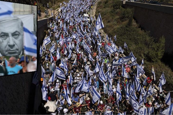 İsrail’de Başbakan Binyamin Netanhayu’nun uygulamayı planladığı, yargının yetkilerini kısıtlayacak yasa tasarısına karşı protestolar sürüyor. İsrail’in başkenti Tel Aviv’de bugün on binlerce kişi yargı reformuna karşı çıkmak için yürüyüş düzenledi. Davul çalıp, hükümet karşıtı slogan atan protestocular Kudüs’e doğru yürüdü. İsrail bayraklarıyla yürüyen protestocular yolları kapatarak yargı reformunun iptal edilmesini istedi.