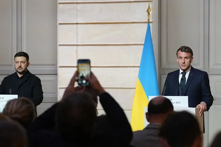 İki lider, Elysee Sarayı'ndaki görüşmelerin ardından ortak basın toplantısı düzenledi. Fransa Cumhurbaşkanı Macron, ortak basın toplantısında Ukrayna'da savaşın sona ermesine yönelik görüşmelerin Ukrayna'nın geleceği ve Avrupa'nın güvenliği açısından "bir dönüm noktası" teşkil edebileceğini söyledi. ABD'nin Ukrayna'da savaşı sona erdirmeye yönelik arabuluculuk girişimlerine ilişkin değerlendirmesinde Macron, "Toprak meselelerini tartışabilecek tek taraf, uluslararası tanınırlığı olan ve egemen bir devlet olan Ukrayna'dır" dedi. ABD tarafından teklif edilen planın halen ilk safhalarda olduğunu söyleyen Macron, önümüzdeki günlerde Ukrayna'ya yönelik güvenlik garantilerine ABD'nin katılımını netleştirmek amacıyla ABD ve Batılı ortaklar arasında kritik görüşmelerin yapılacağını duyurdu. Fransa Cumhurbaşkanı, Ukrayna'ya yönelik barış planının "ancak Avrupalılar da masadayken" nihai hale getirilebileceğini vurguladı. Rusya'nın Ukrayna'ya yönelik kesintisiz saldırılarını kınayan Macron, "Biz barış üzerine konuşurken, Rusya öldürmeye ve yıkmaya devam ediyor" ifadelerini kullandı. "Toprak konusu halen en zor mesele"