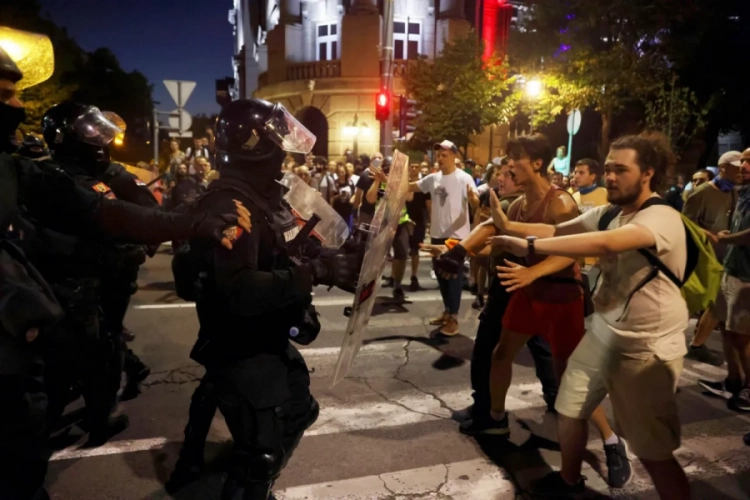 Camları kıran protestocular Cumhurbaşkanı Vucic'i işaret ederek, "İşi bitti" şeklinde slogan attı. Polis protestocuları dağıtmak için göz yaşartıcı gaz kullandı.