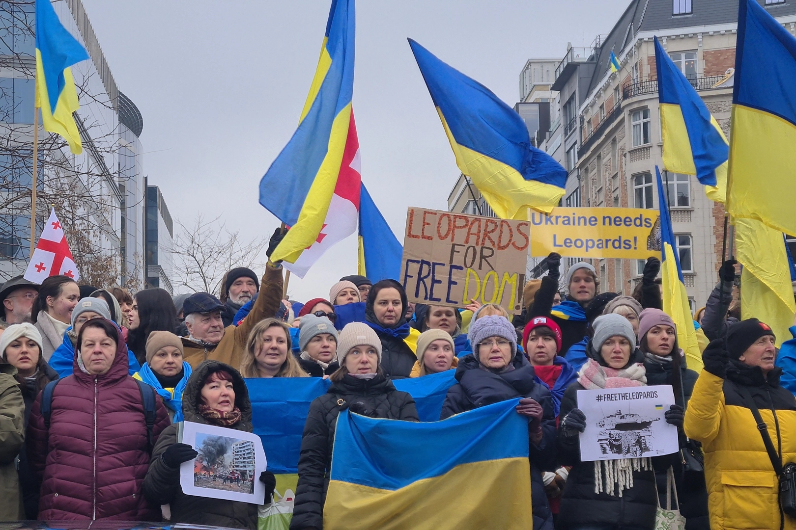 Belçika'nın başkenti Brüksel’de sabah saatlerinde toplanan AB Dışişleri Bakanları Konseyi Toplantısı devam ediyor. Bakanlar toplantı gerçekleştirirken, Ukraynalı sığınmacılar ise Schuman Meydanı’nda toplandı. Soğuk havaya rağmen bir araya gelen sığınmacılar, Ukrayna bayraklarıyla sloganlar attı. Çoğunluğu kadınlardan oluşan Ukraynalılar, AB yetkililerine seslerini duyurmaya çalışarak Avrupa Birliğinin (AB) Leopard tankları konusunda Ukrayna'ya destek kararı almasını istedi.