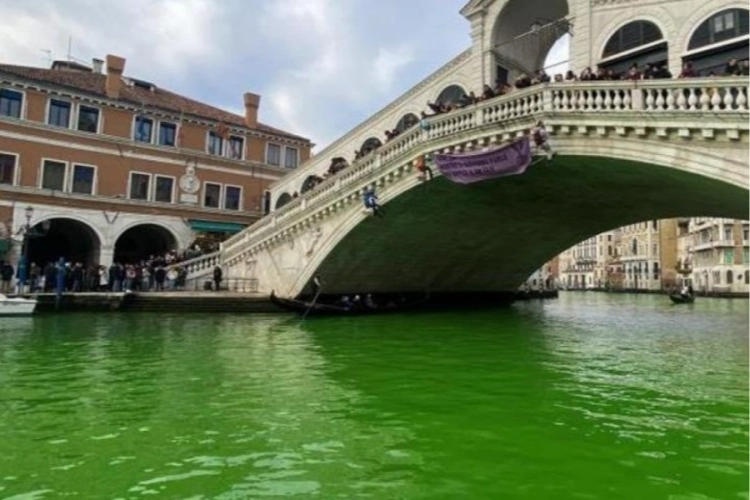 Extinction Rebellion (Yokoluş İsyanı) adlı aktivist grup, Birleşik Arap Emirlikleri'nin (BAE) Dubai kentinde düzenlenen COP28 İklim Zirvesi'nde ilerleme kaydedilmemesini protesto etti. İtalya'nın Venedik kentinde bulunan Büyük Kanal'a boya dökerek suyun rengini yeşile çeviren aktivistler, kanal üzerindeki Rialto Köprüsü'nden halatlar yardımıyla sarkarak, "COP28: Hükümet konuşurken biz pamuk ipliğine bağlıyız" yazılı pankart açtı.