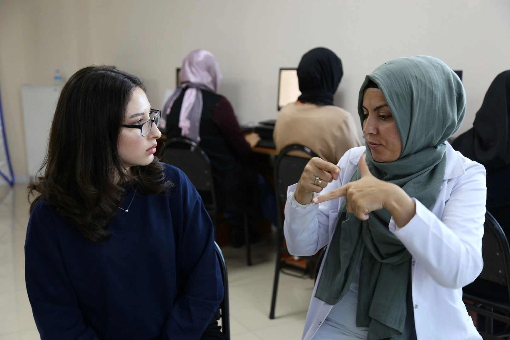Gölcük KO-MEK Kurs Merkezinde verilen eğitime 14 kursiyer katılıyor. Eğitimler, alanında uzman olan ve yine kendisi de işitme engelli eğitmen Dilber Özcan tarafından veriliyor. Bilgisayarda hızlı klavye kullanımı kursuna katılan kursiyerler, F klavye kullanımını öğrenerek klavye tekniklerini ve hızlı yazım teknikleri hakkında eğitimler alıyor.