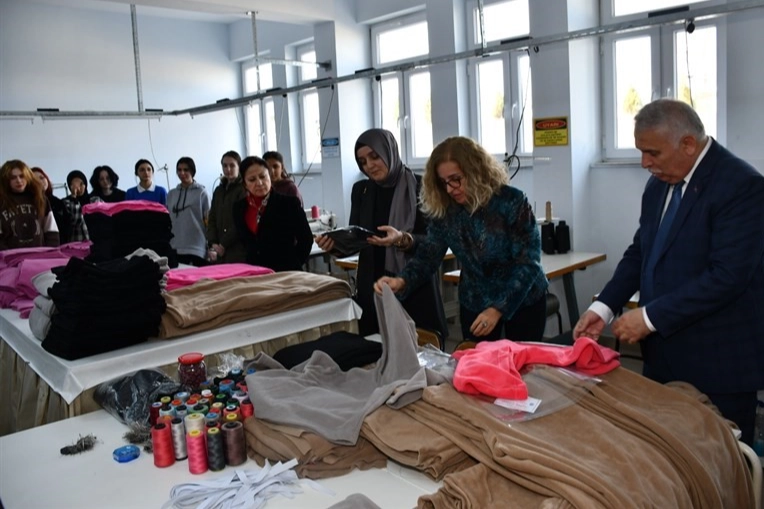 Ziyaretleri sırasında Moda Tasarım Alanı Bölümünü gezen Vali Yıldırım, kıyafetlerin üretim süreci hakkında yetkililerden bilgi aldı.
