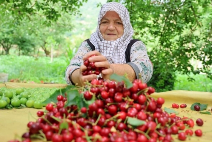 Eşiyle birlikte kiraz hasadı yapan ve ağaçların tepesine tırmanıp kiraz toplayan Fatma Demir, bu işi herkesin yapabileceğini ve kendisine göre kolay bir iş olduğunu belirtti.