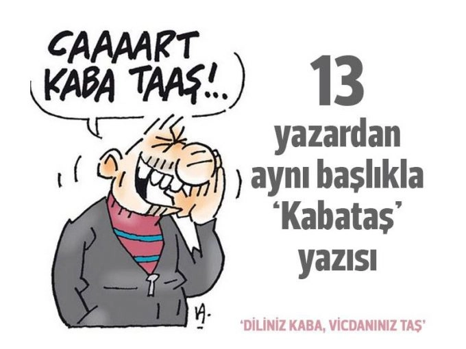 Kabataş saldırısı, iddiaların savunucularından gazeteci Elif Çakır’ın avukatı Fidel Okan’ın “Kabataş saldırısı kurgu ve düzmeceydi” sözleriyle yeniden gündeme gelirken, hükümete yakınlığıyla bilinen Star, Yeni Şafak, Sabah, Yeni Akit ve Türkiye gazetesinden 12 köşe yazarı bugünkü (5 Mart 2015) yazısında “Diliniz KABA, vicdanınız TAŞ” başlığını kullandı. Yeni Şafak Gazetesi Ankara Temsilcisi Abdülkadir Selvi de yazısında tek kelimelik değişiklik yaparak “Diliniz KABA, yüreğiniz TAŞ” başlığını kullandı.