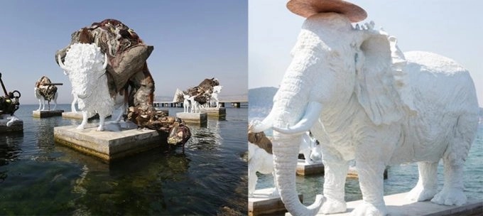 Troçki’nin misafirleri, Aran Villar Rojas’ın muhayyilesinden doğan bir hayvanlar grubu. Birebir ölçülerde üretilmiş zürafa, gergedan, goril, at, köpek, bizon ya da geyik denizin içinde dikilmiş, gözlerini Troçki’nin artık bir metruk yapıya dönmüş İstanbul’daki evine çevirmiş, öylece duruyorlar. Denizin içinde, kucaklarında, sırtlarında, yanlarında taşıdıkları hayali dostlarıyla birlikte, sanki Troçki’nin boş pencerelerden birine çıkıp eski köşkü ele geçirmeleri için işaret vermesini bekliyorlar.
