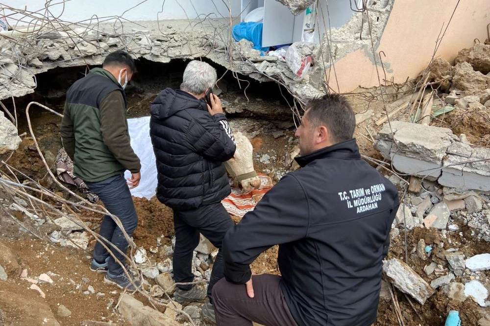 Adıyaman merkeze bağlı Börkenek köyünde depremden 15 gün sonra enkazda kalan bir inek sağ olarak kurtarıldı. Ardahan İl Tarım ve Orman Müdürlüğü ekipleri deprem bölgesinde hasar tespit çalışması ve bulaşıcı hastalıklarla mücadele kapsamında bölgede göreve başladı. Ekipler Koordinatör İl Müdürü olarak Adıyaman’da göreve başlayan Fatih Cineviz ile birlikte merkeze bağlı köyler ve ilçelerde çalışmalara devam ediyor. Çalışmalar kapsamında Adıyaman'ın Börkenek köyünde bulunan ekipler afetin 15'inci günü, göçük altında kalan büyükbaş hayvanı tespit etti. İş makinesi yardımıyla enkazdan çıkartılan ineğin ilk tedavisini Ardahan İl Tarım ve Orman Müdürlüğünde görevli Veteriner Hekim Akın Saraçoğlu yaptı. Koordinatör İl Müdürü olarak Adıyaman’da göreve başlayan Ardahan İl Müdürü Muhammet Fatih Cineviz, farklı illerden gelen tarım bakanlığı ekiplerini bulaşıcı hayvan hastalıkları ile mücadele kapsamında organize ediyor. Saha çalışmaları devam ederken, 15 gün boyunca enkaz altında kalan büyükbaş hayvanı tespit ettiklerini söyleyen Cineviz, "İş makinesi yardımıyla ‘Asi’ isimli inek enkazdan çıkartıldı. İlk tedavi Ardahan ekipleri tarafından yapıldı. Kahramanmaraş merkezli deprem afeti hayvancılık işletmelerini de olumsuz etkilemiş durumda. Depremden zarar gören hayvanların halk sağlığını olumsuz etkilememesi adına çalışmalara hızla devam ediyoruz" dedi.