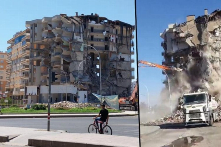 Kahramanmaraş merkezli depremlerde etkilenen kentlerden olan ve 1'i boş 7 binanın yıkıldığı Diyarbakır'da, ağır hasarlı yapıların yıkım işlemleri devam ediyor. Bağlar ilçesi Tesisler Kavşağı üzerindeki 6 katlı Serin-1 Apartmanı, kontrollü yıkım sırasında çökme meydana geldi. Çökmeyle birlikte çevreyi toz bulutu kaplarken, o anlar cep telefonu kamerasına yansıdı. Çöken binada enkaz kaldırma çalışmaları sürüyor.