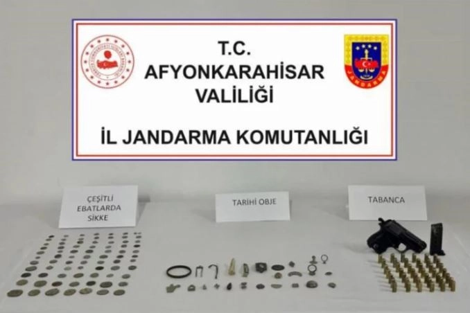 Olay, Sandıklı ilçesinde meydana geldi. Edinilen bilgilere göre, İl Jandarma Komutanlığı Kaçakçılık ve Organize Suçlarla Mücadele Şube Müdürlüğü ekipleri ellerinde tarihi eser bulunan şahısların olduğu bilgisini aldı. Bunun üzerine önceden belirlenen bir adrese eş zamanlı baskın düzenleyen ekipler 25 tarihi obje, 78 adet çeşitli ebatlarda sikke, bir adet kuru sıkı tabanca ve mermiler ele geçirildi. Olayın ardından B.G., N.G. ve C.Y. isimli şahıslar gözaltına alındı.