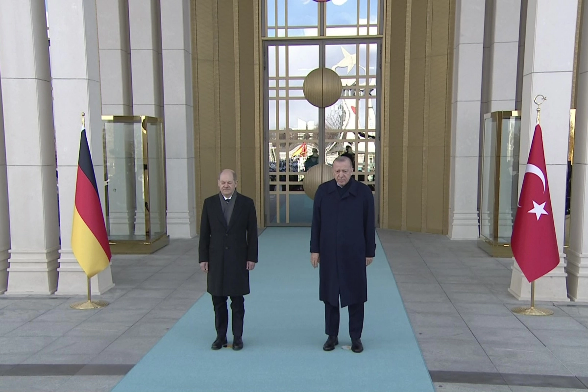 Scholz, Muhafız Alayı Tören Kıtası'nı 'Merhaba Asker' diyerek selamladı. Törende, tarihte kurulan 16 Türk devletini temsil eden bayraklar ve askerler de yer aldı. Heyetlerini birbirine takdim eden Erdoğan ve Scholz, merdivenlerde Türkiye ve Almanya Federal Cumhuriyeti bayrakları önünde gazetecilere poz verdi.