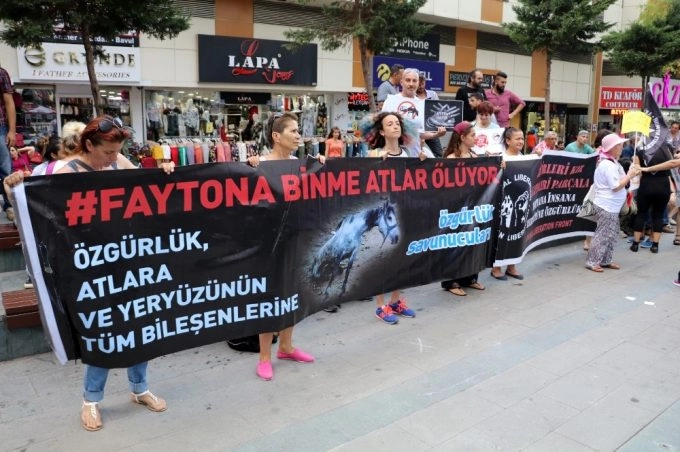 Antalya’da geçtiğimiz gün faytona koşulan bir atın aşırı sıcak ve susuzluktan ölmesi üzerine, Antalya’daki hayvan hakları savunucuları protesto eylemi yaptı. Hayvan hakları savunucuları, belediyenin para cezası ile yetinmesine karşı fayton uygulamasının tamamen kaldırılmasını istediler.Antalya Hayvan Hakları Aktivistleri’nin Kışlahan Meydanı’nda düzenlediği eyleme, Antalya Barosu Hayvan Hakları Kurulu, Antalya Hayvan Hakları Dernekleri, Yerel Hayvan Koruma Görevlileri ve CHP Gençlik Kolları katılarak destek verdi. Eylemciler, yoldan geçen bazı vatandaşların da desteğini aldı.“Kanun hükümleri yok sayılarak hayvanların zulmüne göz yumuluyor”Bir atın ortalama 25 yıl yaşarken, faytona koşulan atların ömrünün sadece 2 yıl olduğunu söyleyen Hayvan Hakları Aktivisti Üner Muslukçu, “Doğal olmayan bir şekilde yaşamını yitiren, ölürken bile paraya dönüştürülen atların yerine hemen başka atlar getiriliyor. Gerek Hayvan Koruma Kanunu, gerekse belediyelerin ilgili mevzuatlarında açık hükümlere yer verilmesine rağmen insanlar ve maalesef ki idari merciler kanunlara aykırı hareket ederek ve kanun hükümlerini yok sayarak hayvanların zulmüne göz yummakta ve idari işlemler bu zulümler karşısında yetersiz kalmakta” şeklinde konuştu.“Faytonculuk derhal yasaklanmalı”Taleplerinin “daha az fayton” ya da “atlar için daha iyi yaşam koşulları” olmadığını ifade eden Muslukçu, faytonun yasaklanması gerektiğini ifade etti. Üner Muslukçu, “Nostalji ve turizmin bir unsuru olarak pazarlanan, zulüm ve sömürü sistemi ile ayakta duran faytonculuk derhal yasaklanmalıdır. Sömürülen tüm atların yaşam hakları güvence altına alınarak ömürlerinin sonuna kadar yaşamsal ihtiyaçlarının giderileceği, her türlü tehlikeden ve tehditten uzak bir şekilde özgürce yaşayabilecekleri bir tesiste yaşamaları sağlanmalıdır” dedi.Atların faytonda çalıştırılmasının atların doğasına aykırı olduğunu belirten Antalya Barosu Hayvan Hakları Kurulu adına konuşan Avukat Alev Ersan, yaşanan olaydan ve atın ölümünden sorumlu olan at sahibi ve diğer sorumlular hakkında suç duyurusunda bulunacakların dile getirdi.Eylem, sloganların atılması ile son buldu. Daha sonra eylemciler faytonların bulunduğu Attalos Heykeli önüne kadar yürümek isterken, talepleri polis tarafından geri çevrildi ve grup olaysız bir şekilde dağıldı.