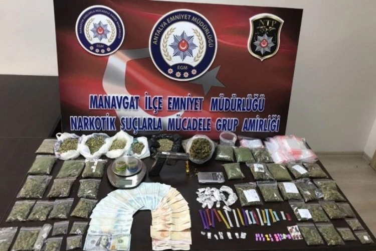 Antalya’nın Manavgat ilçesinde düzenlenen uyuşturucu operasyonunda satışa hazır vaziyette esrar, kenevir tohumu, metamfetamin maddesi, uyuşturucu hap ele geçirildi.Edinilen bilgiye göre, Manavgat İlçe Emniyet Müdürlüğü Narkotik Suçlarla Mücadele Grup Amirliği ekipleri, E.Y.’nin Bahçelievler Mahallesi’nde uyuşturucu maddesi satışı yaptığı bilgisine ulaştı. E.Y.’nin evine baskın düzenleyen polis, 62 paket halinde 679,3 gram esrar maddesi, 30 paket halinde 425 gram kenevir tohumu, 7 paket halinde alüminyum folyoya sarılı 1,6 gram metamfetamin maddesi, 22 adet uyuşturucu extacy hap, 2 adet elektronik hassas terazi, 1 adet ruhsatsız tabanca ile uyuşturucu madde satışından elde edildiği değerlendirilen bin 920 TL, 100 dolar, 50 ruble ve 6 euro para ele geçirdi. Ayrıca evde bulunan H.N.’nin üzerinde yapılan aramada ise 2,9 gram esrar maddesi ele geçirildi.Gözaltına alınan şüphelilerden H.N. Cumhuriyet Savcısının talimatıyla serbest bırakılırken, E.Y. ise "uyuşturucu veya uyarıcı madde ticareti yapmak ve sağlamak" suçundan adliyeye sevk edildi.