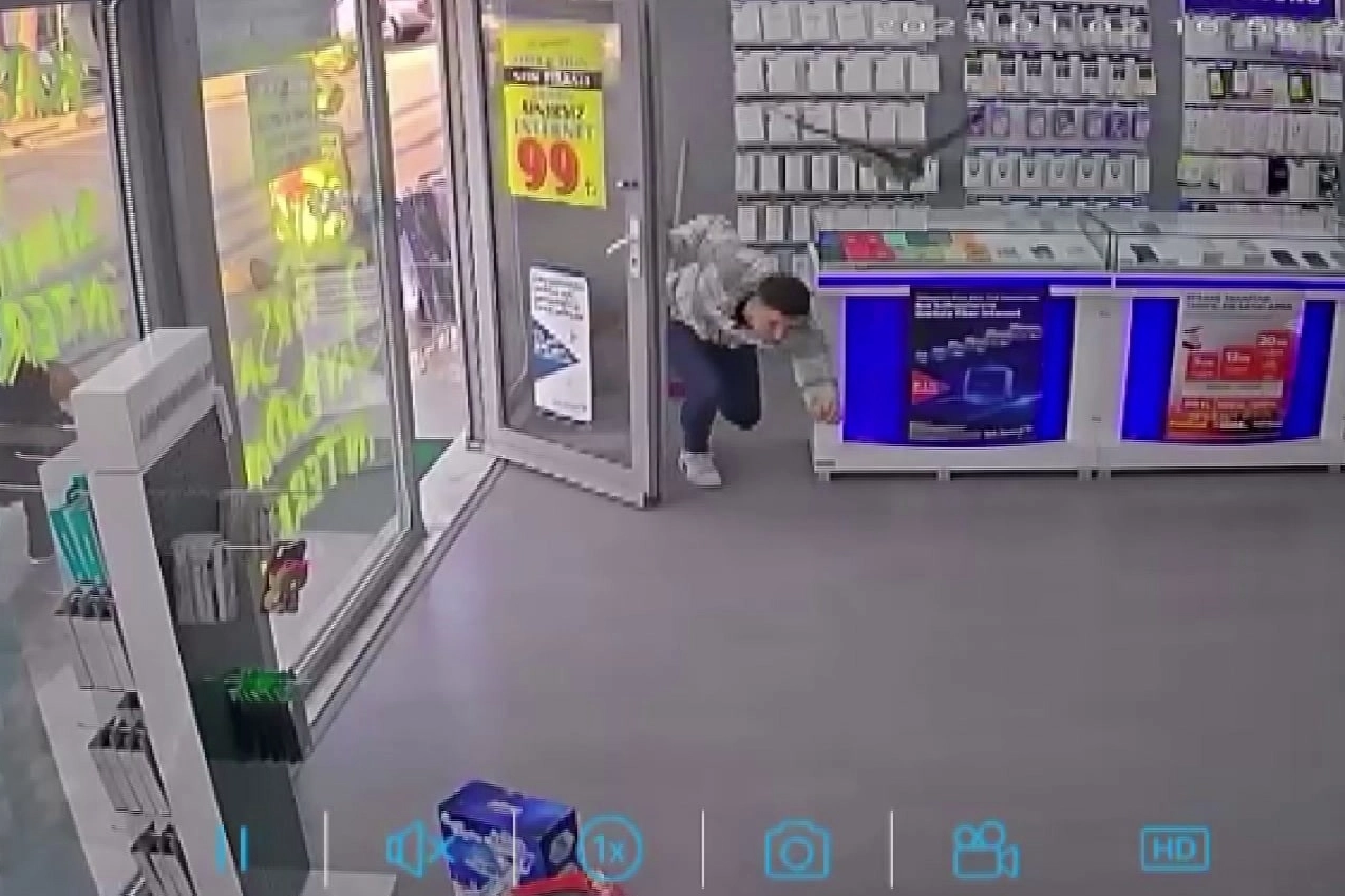 İstanbul Beykoz’da, yakaladığı serçe ile telefon mağazasının kapısından uçarak giren atmaca, ortalığı birbirine kattı.