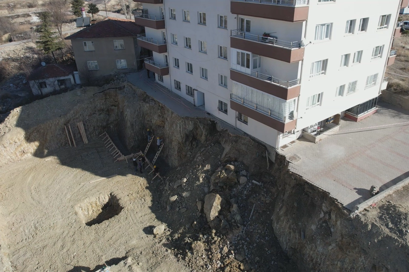 Havanın aydınlanması ile binanın girişinde oluşan hasar net olarak görüldü. Arka girişi çöken apartman dron ile görüntülendi.