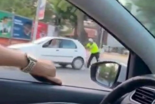 Bunun üzerine bir trafik polisi sürücüye yardımcı olmak için aracını itmeye, araç koltuğunda bulunan sürücü ise cep telefonuyla konuşmaya başladı. Sürücü telefondaki kişiye, 'Sanayiye gidiyorum yavrum' derken, o sırada aracı itmeye devam eden trafik polisi, "Ben seni itekliyorum, sen telefonla konuşuyorsun" diyerek hem sitem etti hem tepki gösterdi.