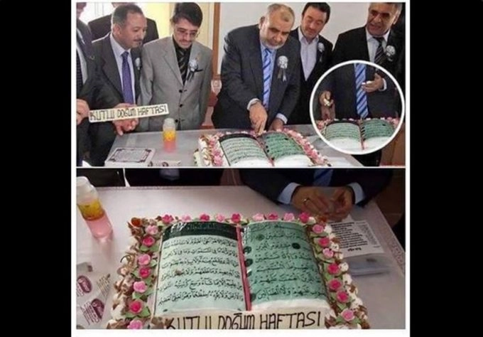 Tokat'ın Zile ilçesi Müftülüğü'nün Kutlu Doğum Haftası gerekçesiyle düzenlediği etkinlikte Kur'an-ı Kerim tasarımlı pasta kesildi ve dağıtıldı. Olay sosyal medyada konuşuluyor: Şunu bir başkası yapsa ortalığı yıkarlardı.