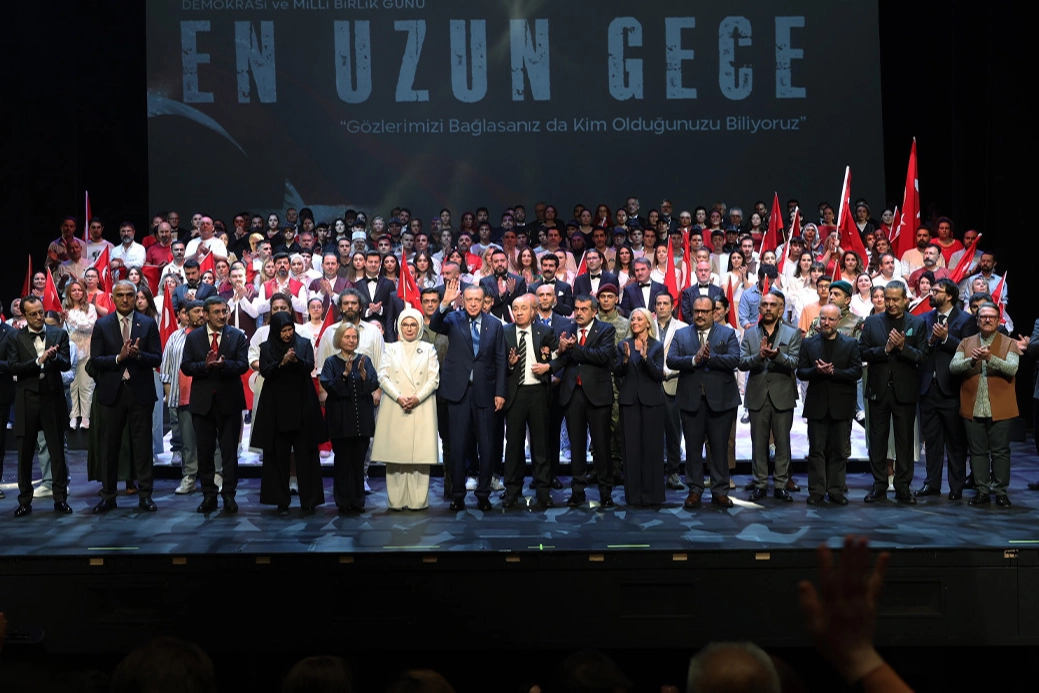 Cumhurbaşkanı Recep Tayyip Erdoğan ve eşi Emine Erdoğan, Cumhurbaşkanlığı Külliyesi Beştepe Millet Kongre ve Kültür Merkezi’nde 15 Temmuz Demokrasi ve Milli Birlik Günü dolayısıyla hazırlanan ’En Uzun Gece’ destanının ilk temsiline katıldı.