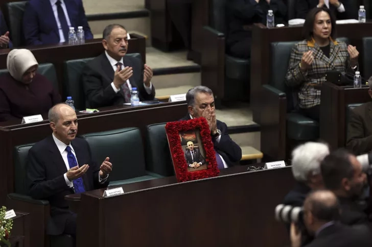 AK Parti grup toplantısı öncesinde deprem felaketinde hayatını kaybeden Adıyaman milletvekili Yakup Taş'ın oturduğu koltukta, fotoğrafı yer aldı.