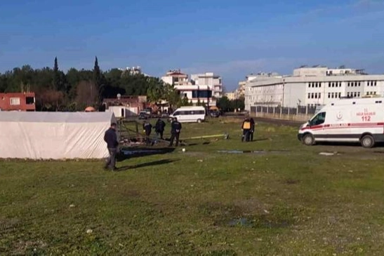 Olay, İlçeye bağlı Numuneevler Mahallesinde meydana geldi. Yaşanan depremler nedeniyle alana kurulan 5 kişilik yabancı uyruklu ailenin yaşadığı çadır da sabah saatlerinde bilinmeyen bir nedenle yangın çıktı. Yangının haber verilmesi üzerine olay yerine sağlık ve polis ekipleri sevk edildi. Çıkan yangında dumandan etkilenen Darin Dozan yaşamını yitirdi. Dumandan etkilenen 4 kişi ise hastaneye sevk edilerek tedavi altına alındı.