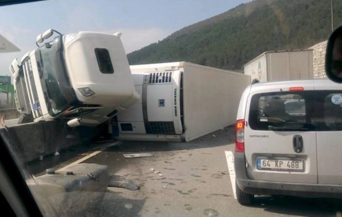 Sakarya’nın Geyve ilçesinde meydana gelen trafik kazasında yan yatan tır karşı şeritteki otomobile çarptı. Kazada 3 kişi yaralandı.Edinilen bilgilere göre, Sakarya-Bilecik karayolu Alifuatpaşa girişinde meydana gelen trafik kazasında S.Ö. idaresindeki tır, sürücüsünün direksiyon hakimiyetini kaybetmesi sonucu kontrolden çıkarak yolun ortasındaki betonları devirdi. Devrilen tır, karşı şeritten geçen otomobile çarptı. Trafik kazasını gören diğer sürücüler, itfaiye ve sağlık ekibine haber verdi. Olay yerine gelen ekipler hemen yaralılara müdahale etti. Yaralanan tır sürücüsü S.Ö. ve otomobilde bulunan iki kişi Sakarya Eğitim ve Araştırma Hastanesine kaldırılarak tedavi altına alındı. Meydana gelen kaza sonrasında trafik çift yönlü ulaşıma kapandı. Olay yerine çağrılan vinç yardımıyla devrilen tır kaldırılması sonrasında trafik normale döndü. Kazayla ilgili inceleme başlatıldı.