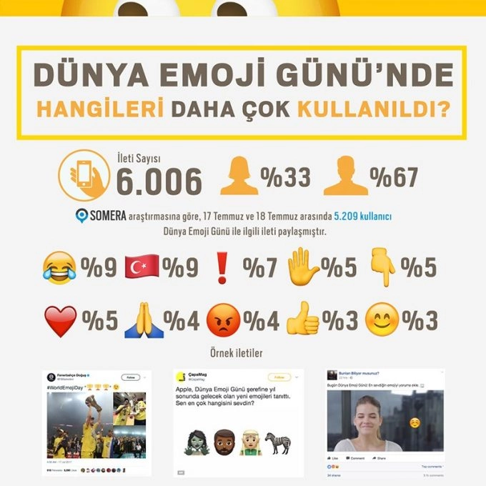 17 Temmuz Dünya Emoji günüyle ilgili sosyal medya araştırması yapıldı. Yapılan araştırmada 5 bin 209 kullanıcı toplam 6 bin 6 adet ileti paylaştı.Sosyal medya araştırma şirketi Somera, 17 Temmuz Dünya Emoji günüyle ilgili sosyal medya araştırması yaptı. Araştırmaya göre, 17 ve 18 Temmuz’da 5 bin 209 kullanıcı, güne özel toplamda 6 bin 6 adet ileti paylaştı. Paylaşılan iletilere cinsiyet bazında bakıldığında yüzde 67’si erkekler, yüzde 33 kadınlar tarafından atıldığı gözlenirken, en çok kullanılan emojiler şöyle sıralandı;Gülmekten gözünden yaş gelen emoji yüzde 9,Türk bayrağı emojisi (yüzde 9), ünlem işareti emojisi yüzde 7,Elin avuç içini gösteren emoji yüzde 5,Aşağıyı gösteren işaret etme emojisi yüzde 5,Kalp emojisi (yüzde 5), özür dilemek/dua etmek emojisi yüzde 4,Sinirli surat emojisi yüzde 4,Evet/tamam/olumlu anlamına gelen el işareti emojisi yüzde 3,Mütevazi surat emojisi yüzde 3.
