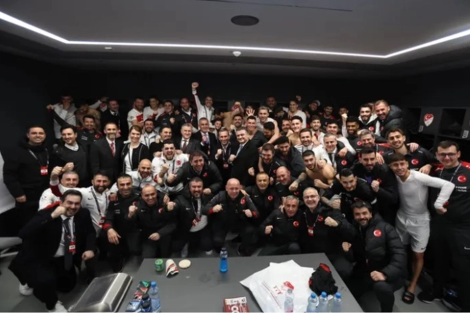 UEFA Uluslar Ligi play-off turu rövanş maçında Macaristan'ı eleyerek 3-0 mağlup eden A Milli Futbol Takımı tarihinde ilk kez A Ligi'ne yükselirken, Cumhurbaşkanı Recep Tayyip Erdoğan, ay-yıldızlı ekibi tebrik etti. Puskas Arena’da oynanan maçın ardından milli takımın soyunma odasında büyük sevinç yaşandı. Gençlik ve Spor Bakanı Osman Aşkın Bak, A Milli Takımı telefonla Cumhurbaşkanı Erdoğan ile görüştürdü. Teknik Direktör Vincenzo Montella ve Türkiye Futbol Federasyonu Başkanı İbrahim Hacıosmanoğlu ile konuşan Cumhurbaşkanı Erdoğan takıma tebriklerini iletti. Vincenzo Montella, Cumhurbaşkanı Erdoğan'a teşekkür edip, "Sayın Cumhurbaşkanım, çok güzel bir galibiyet aldık, umarım sizleri ve Türkiye’yi gururlandırmışızdır. Uzun zamandır, neredeyse üç senedir kendi evinde kaybetmeyen bir takımı yendik. Takımımız muazzam bir işe imza attı" diye konuştu. Cumhurbaşkanı Erdoğan ise "Tebrik ediyoruz, biz de sizinle gururlandık" dedi. Cumhurbaşkanı Erdoğan, İtalyanca 'Grazie' diyerek Teknik Direktör Montella’ya da teşekkür etti. Gençlik ve Spor Bakanı Osman Aşkın Bak da, Cumhurbaşkanı Erdoğan’a, "Tüm takımın selamları var, her iki maçta da çok iyi mücadele ettiler, tebrik ediyoruz. Destekleriniz için teşekkür ediyoruz" ifadelerini kullandı.