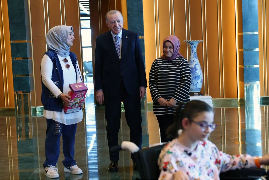 Cumhurbaşkanı Recep Tayyip Erdoğan, kendisiyle görüşmek isteyen engelli iki kız çocuğunu Cumhurbaşkanlığı Külliyesi’nde ağırlayıp akülü tekerlekli sandalye hediye etti.