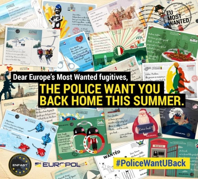 Avrupa Polis Ofisi Europol, en çok aranılan suçluların yakalanması için ilginç kampanya gerçekleştirerek, suçları elektronik kartpostalla aramaya başladı.Europol en çok aranılan suçluların yakalanması için ilginç kampanya gerçekleştirerek suçluların arandığı ülkelerin turistik özellikleri resmedildiği elektronik kartpostalla suçluları aramaya başladı. Europol’un internet sitesinde yer alan kartpostallarda, şüphelinin arandığı ülkenin turistik özellikleri resmediliyor ve şüpheliye geri dönmesi için hazırlanan mesajlar yer alıyor.Europol, kendi internet sitesinden yayınladığı Eyfel Kulesi’nin yer aldığı elektronik kartpostalla kaçak suçlu Faruk Hachi’ye "Sevgili Faruk, tatlı Fransa’da hayatın daha güzel olduğunu biliyorsundur. Umuyoruz ki bize tekrar döneceksin. Özledik seni. İmza: polis" mesajına yer verdi.Öte yandan terörle mücadele kapsamında Ocak 2016’da yakalanan 36 kişiden 11’i halkın verdiği bilgiler sayesinde bulunmuştu.