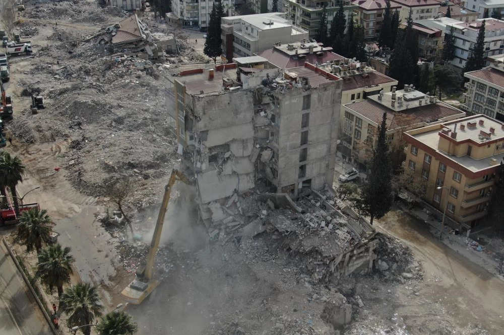 6 Şubat'taki Kahramanmaraş merkezli depremlerin en büyük yıkımı yaptığı Hatay'da yıkılan binaların enkazının kaldırılmasının ardından ağır hasarlı binalardaki çalışmalar devam ediyor. İl genelinde 60 bölgede ağır hasarlı olan binaların yıkım ve enkaz kaldırma çalışmaları sürüyor. İş makineleriyle yıkılan binaların enkazları, demirleri ayrıldıktan sonra kamyonlarla döküm sahasına götürüldü. Demirler ise tırlarla bölgeden taşındı. Bazı depremzedeler evlerinin yıkımını üzüntülü gözlerle takip etti. Çalışmalar dron ile de görüntülendi.