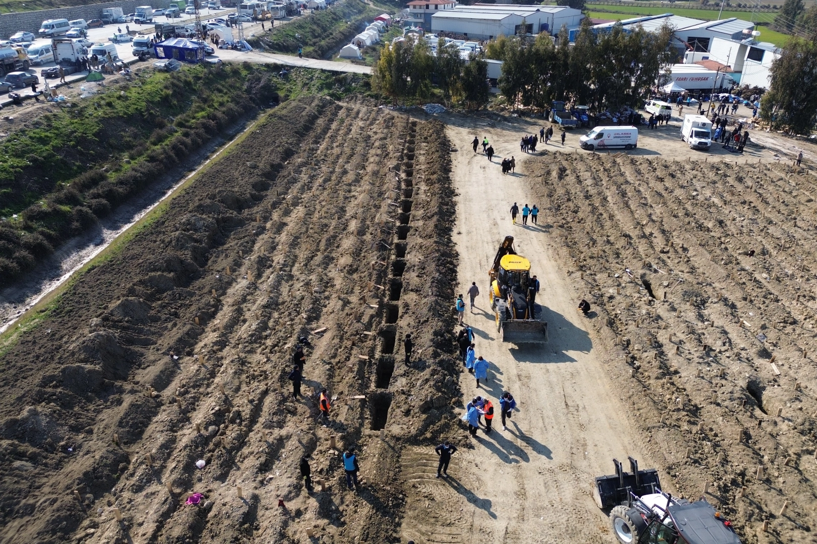 Hatay Kırıkhan'da iş makineleri tarafından yeni oluşturulan mezarlık alanına getirilen cenazeler, dualar eşliğinde toprağa veriliyor. Cenaze işlemlerinin hızlı yapılabilmesi ve karışıklığı önlemek amacıyla mezar taşları isim yerine numaralandırılıyor. Mezarlıkta yaşanan yoğun çalışma dron ile havadan görüntülendi.