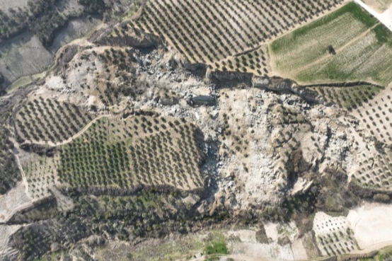 Deprem öncesi ve sonrasında kaydedilen uydu görüntüleri arazinin nasıl değişim geçirdiğini ortaya koyuyor. Deprem sonrası köyde bulunan neredeyse tüm evler kullanılamaz hale geldi. Vatandaşlar kamyonların üzerinde ve çevreye kurduğu çadırlarda yaşamaya devam ediyor. Dron ile çekilen görüntülerde bahçenin ortadan ikiye ayrıldığı net bir şekilde ortaya çıkıyor. Depremden önce tarlada duran zeytin ağaçları depremden sonra birçoğu oluşan yarığın içine girdi.