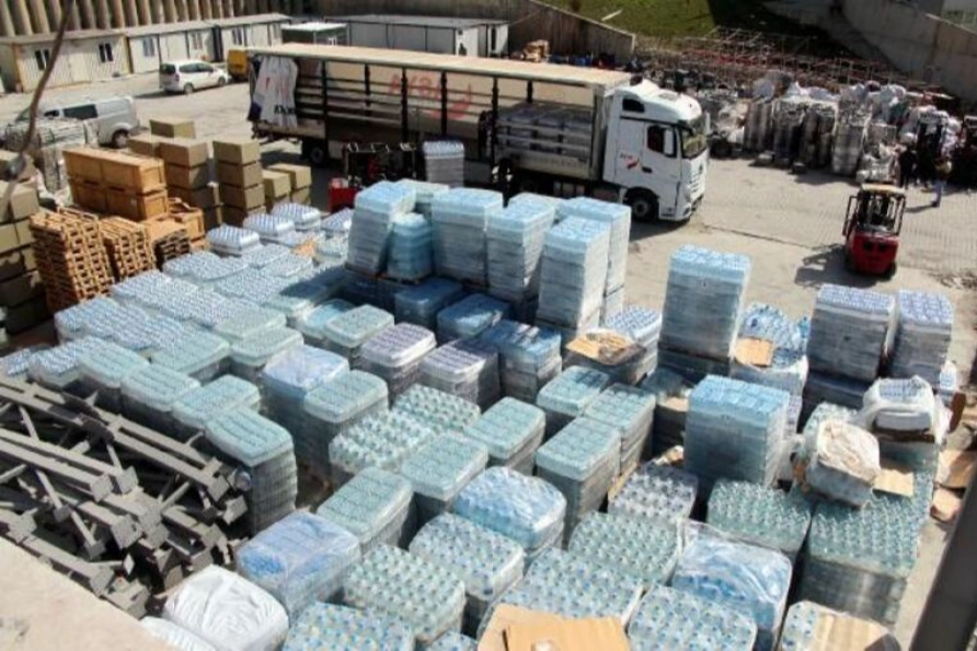 Türkiye'nin dört bir yanından tedarik edilip Hatay'ın çeşitli noktalarına getirilen yüz binlerce litre hazır su, daha sonra forkliftlerle TIR'lara yüklenip kent merkezi ve ilçelerdeki 23 çadır kente, 13 sosyal markete, mobil market araçlarına ve kentteki çadırlarda kalan depremzedelere ulaştırılıyor.