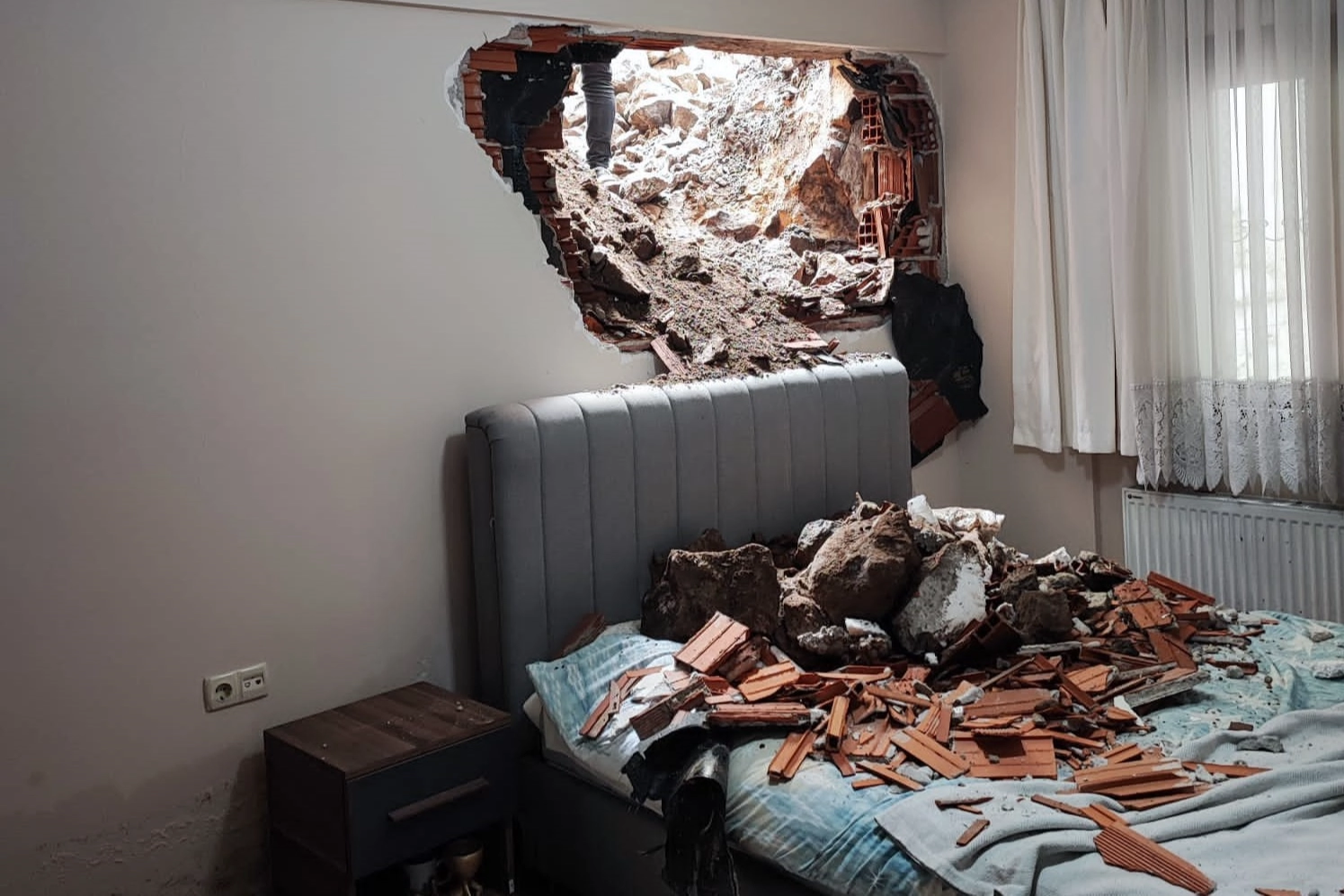 İzmir'in Konak ilçesinde bir inşaatın temel kazma çalışmaları esnasında kazı yapan iş makinesi, başka bir evin duvarını deldi. Olay saat 14.00 sıralarında Altıntaş Mahallesi'nde meydana geldi. Sokakta bir inşaatın temel kazma çalışmaları sırasında kazı yapan iş makinesinin kırıcı ucu, inşaatın bitişiğinde bulunan evin duvarına denk geldi. Büyük bir gürültüyle duvarın bir kısmı yatak odasına yıkılırken, molozlar evin içerisine girdi. Bu esnada evde bulunan ev sahibi Türkan Nur Akgün, büyük bir panik yaşadı. İhbar üzerine olay yerine polis ekipleri gelirken, şans eseri ölen ya da yaralananın olmadığı olayla ilgili soruşturma başlatıldı.