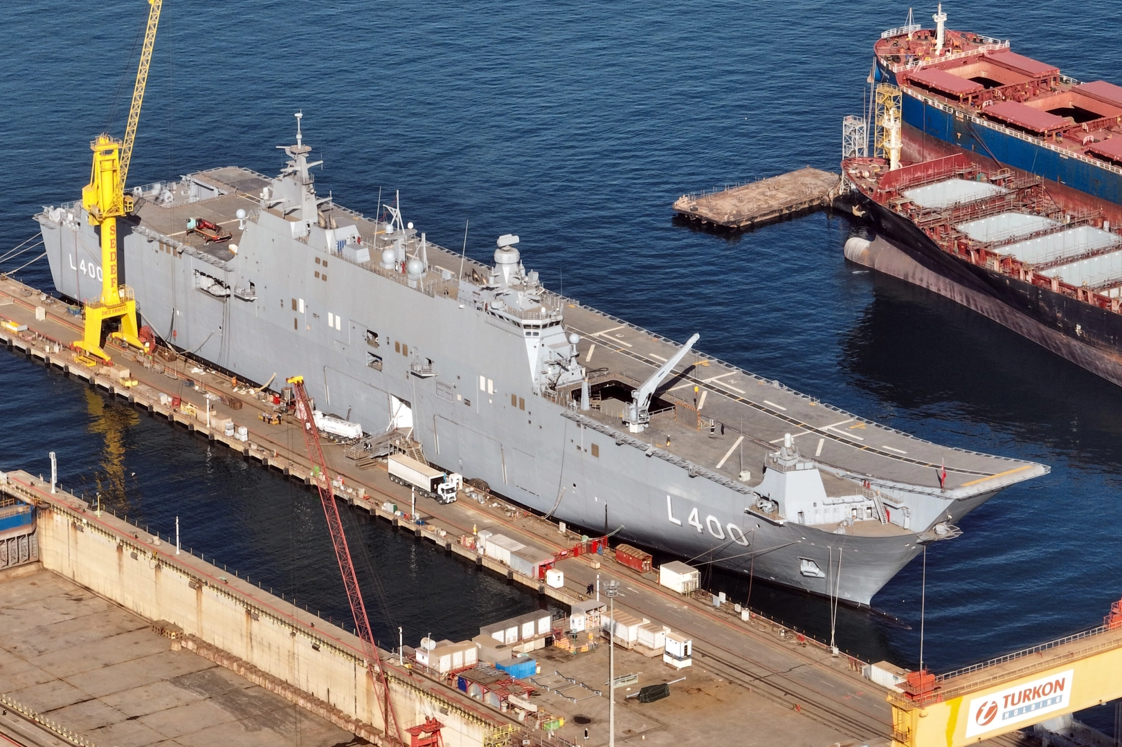 Türk Deniz Kuvvetleri’nin amiral gemisi olacak TCG Anadolu veya Anadolu L-400 isimli amfibik hücum gemisinin son durumu havadan görüntülendi. Büyük bir kısmı tamamlanan 231 metre uzunluğunda 32 metre genişliğindeki gemi tüm heybeti ile görenleri kendine hayran bırakıyor. TCG Anadolu ana yapılandırması bakımından Türkiye'nin amfibi hücum gemisi (LHD) sınıfına giren ilk gemi olma özelliğini taşıyor.