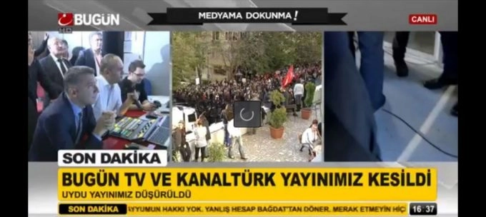 Kanaltürk ve Bugün TV'ye sivil polislerin girmesinin ardından saat 16.30 sıralarında yayın kesildi. Sivil polislerin binaya girişi sırasında Kanaltürk Genel Yayın Yönetmeni Tarık Toros, rejiden canlı yayındaydı. Toros, sivil polislerin "uydu odasına" girdiğini belirterek her an yayınlarının kesilebileceğini kaydetti. Toros'un konuşması devam ederken saat 16.30 sıralarında iki kanalın da ekranı karardı.