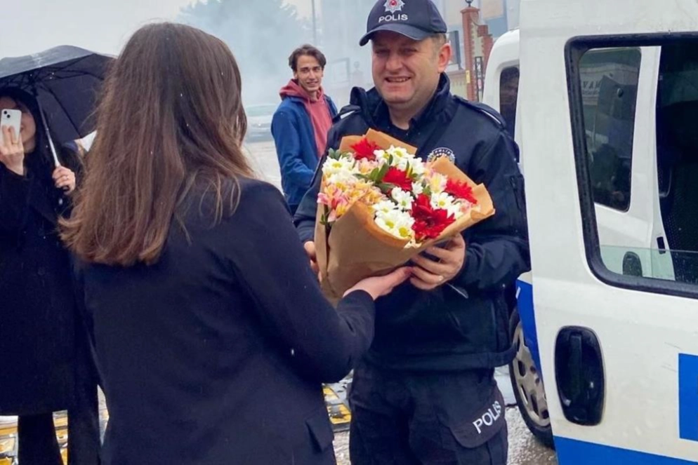 Kocaeli’nin İzmit ilçesinde kavga ihbarı üzerine yola koyulan polis ekipleri, vardıkları noktada büyük bir sürprizle karşılaştı. İhbar, Dündar Bilim Eğitim Kurumları tarafından verildi ve binanın önünde öğrencilerin kavgaya tutuştuğu söylendi. Olay yerine sirenleri açarak hızlı bir şekilde ulaşan polis ekipleri geldiği esnada ise düzmece kavga sona erdi. Kavganın yerini alkışlar, meşaleler ve konfetiler aldı. Kısa süreli şoke olan polis ekipleri daha sonra araçtan inerek kuruma ve öğrencilere teşekkür etti. Polis Haftası’nı böyle bir sürprizle kutlayan kurum ve öğrenciler, polis ekiplerine çiçek takdim etti. O anlar, saniye saniye kameralara yansıdı. “Polislerimize güzel bir etkinlik olsun istedik” Her sene bu haftaya önem verdiklerini belirten Müdür Yardımcısı ve Türk Dili ve Edebiyatı Öğretmeni Elif Özsoy, “Biz her sene bu haftayı özellikle kutlamaya çalışıyoruz. Bizim için önemli olan bir hafta. O gün de öncesinde planlamıştık. Polislerimize güzel bir etkinlik olsun istedik. Zaten çok yorulduklarını biliyoruz. Onların emeklerini asla yadsıyamayız. Bu sebeple, önceden haberleri olmadan onları çağıralım istedik, sanki bir olay varmış gibi yaptık. Geldiklerinde ilk etapta çok şaşırdıklarını gözlerinde gördüm. Çok da mutlu oldular. Sağ olsunlar, sonrasında teşekkür etmeye de geldiler. Onları mutlu edebilmek bizim de çok hoşumuza gitti. Çok kıymetliler bizim için. Öğrencilere neyi nasıl yapacağımızı aynı günün sabahında söyledik. Kendileri de heyecanlandılar. Hatta birçoğu aktif olarak rol almak istedi. Kimisi çiçeği vermek, kimisi müzikle ilgilenmek istedi” diye konuştu. “Onları gururlu hissettirmek bizi çok iyi hissettirdi” Polisleri mutlu etmenin kendilerini sevindirdiğini söyleyen öğrenci Beyza Yılmaz, “Polisleri mutlu etmek, onları gururlu hissettirmek bizi çok iyi hissettirdi. Zaten geldiklerinde onların mutluluğunu da hissettik. Çok güzel alkışlarla uğurladık onları. Çiçek verdik. Çok güzel bir etkinlik oldu bizim için” dedi. “Polislerimizi biraz olsun kötü günlerden uzaklaştırıp mutluluğa yaklaştırmak bizi de sevindirdi” Polislerin özel haftalarında muhakkak hatırlanmaları gerektiğini ifade eden öğrenci Mehmet Emre Ulugöl, “Polis Haftası vesilesiyle tüm polislerimizi kutluyorum. Mutlulukla, gururla kutluyorum. Bu fikir aslında her sene yapılması gereken ve bu kurumda yapılan bir etkinlik. Geldiklerinde mutlu olup gururlandılar. Çok sevindiler ve birazcık da şok oldular. Onun dışında biz de sevinip gururlandık. Polislerimizi mutlu etmek, biraz olsun kötü günlerden uzaklaştırıp mutluluğa yaklaştırmak bizi de sevindirdi” ifadelerini kullandı.