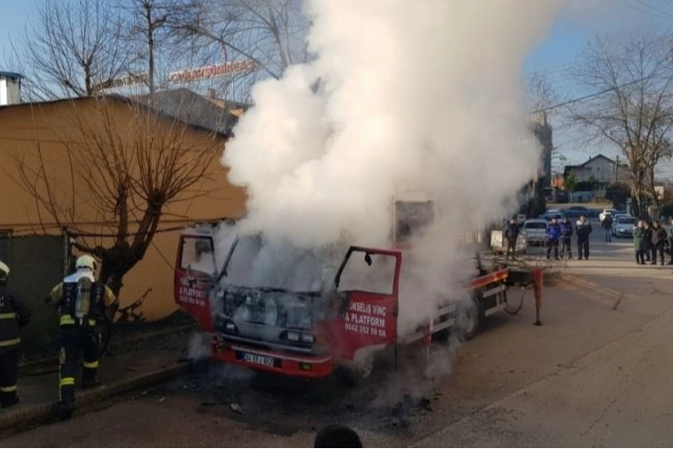 Seymen Mahallesi Cuma Sokak'ta ağaçların budanması için çağrılan özel bir firmaya ait 34 EFJ 652 plakalı sepetli vinçte, henüz bilinmeyen nedenle yangın çıktı.