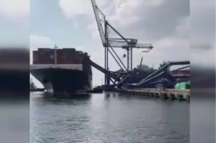 Özel bir limana yanaşan gemi kıyıya çarpınca bölgede bulunan vinçler devrildi.