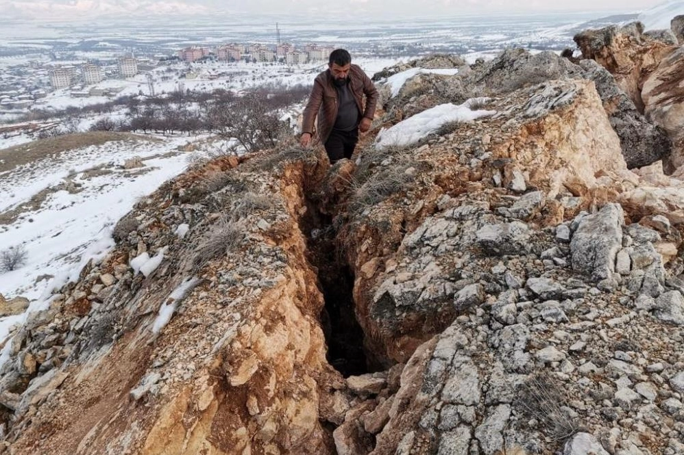 Kahramanmaraş merkezli depremlerin vurduğu Malatya’nın Akçadağ ilçesinde bir dağda derin yarıklar oluştuğu görüldü.