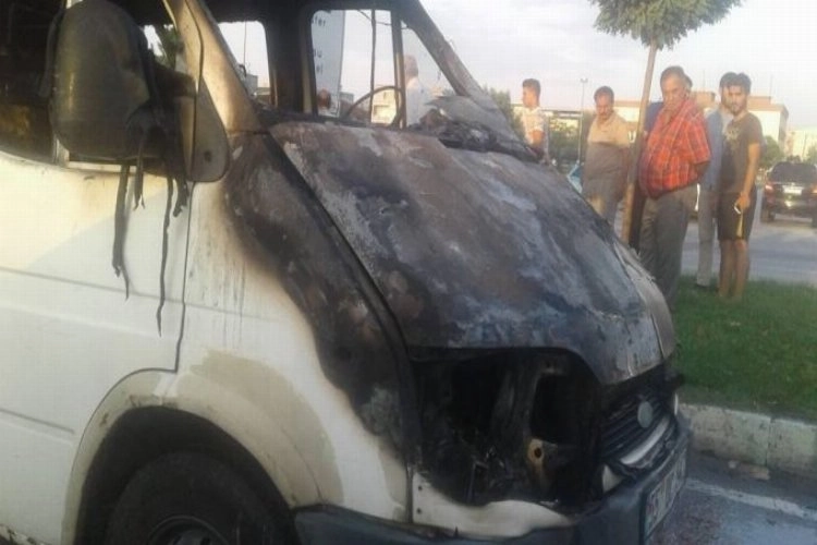 Bursa’da seyir halindeki minibüs alev alev yandı.Yangın, merkez Yıldırım ilçesi Arabayatağı Mahallesi’nde meydana geldi. Edinilen bilgiye göre, seyir halindeki minibüs biranda alev aldı. Sürücü kendini dışarıya atarken, alevler aracın ön tarafını sardı. Vatandaşların ilk müdahalesinin ardından olay yerine gelen itfaiye ekipleri, yangını söndürdü. Aracın büyük bir kısmı kullanılamaz hale geldi. Yangınla alakalı tahkikat sürüyor.