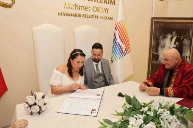 Nikah tarihlerini 14 Şubat Sevgililer Günü’ne denk getirerek özel ve akılda kalıcı bir tarihte evlenmek isteyen çiftler Marmaris Belediyesi nikah salonunda mutluluğa adım attı. Özel bir tarihte evlenmenin mutluluğunu yaşayan çiftler, akrabalarının ve arkadaşlarının huzurunda ’Evet’ dedi. Marmaris Belediyesi de nikahı kıyılan çiftlere kalp şeklinde pasta hediye etti. 14 Şubat’ta 4 çiftin nikahı kıyılırken, evlenmek için bu özel günü seçen mutlu çiftler bu tarihin kendilerine şans getireceğine inandıklarını belirtti. Diğer yandan 19 Mayıs Gençlik Meydanı’nda da Sevgililer Günü için özel bir fotoğraf köşesi hazırlandı. Bugünü ölümsüzleştirmek isteyenler alanda bol bol fotoğraf çektirdi.