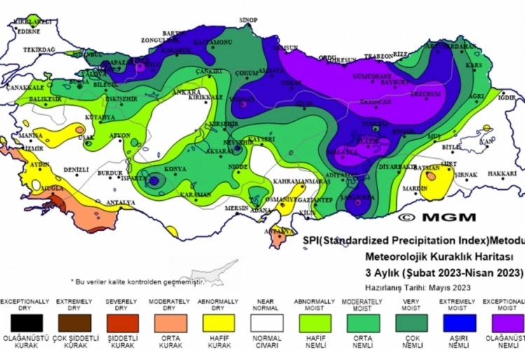 Kuraklık analizlerine göre ise uzun yıllar sonra ilk defa Türkiye haritası büyük değişim gösterdi. 'Olağanüstü', 'çok şiddetli' ve 'şiddetli' kuraklık verilerinin etkili olduğu ülke genelinde, son 3 aylık Standart Yağış İndeksi'ne göre Bodrum civarlarında 'şiddetli', Güney Ege ve Hatay'ın güneyindeki 'orta' kurak verileri haricinde; ülke genelinde büyük kesim 'normal', 'hafif', 'orta', 'çok, aşırı' ve 'olağanüstü' nemli veriler gösterdi. Normalin Yüzdesi Metodu'na göre yine Ankara, Kilis, Hatay ve Karaman haricindeki tüm bölgelerde 'normal ve üzeri risk yok' verisi ile ağırlıklı siyah ve kahverengi tonlardan oluşan kuraklık haritası, yeşil ve mavi ton renklere dönüştü.