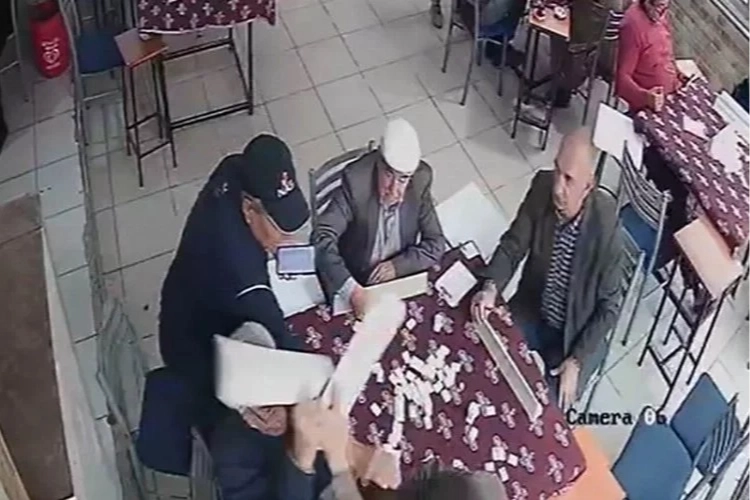Güvenlik kameralarına yansıyan görüntülerde, okey oynarken oyunu bitiremediği için gerildiği gözlenen dedelerden biri yanında bulunan diğer dedeye öfkelendi.